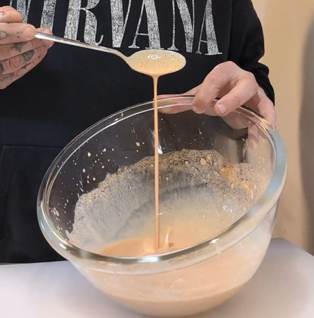 Para obtener un pollo asado especiado con pimentón y curry, crujiente por fuera y tierno por dentro, preparé una marinada mezclando en un bol grande pimentón, curry, pimienta negra, leche y harina hasta obtener una salsa cremosa y homogénea, perfecta para adherirse al pollo. Utilicé un bol lo suficientemente grande como para sumergir el pollo después de haberlo limpiado y abierto completamente. Una vez marinado, coloqué el pollo en el frigorífico durante al menos media hora.