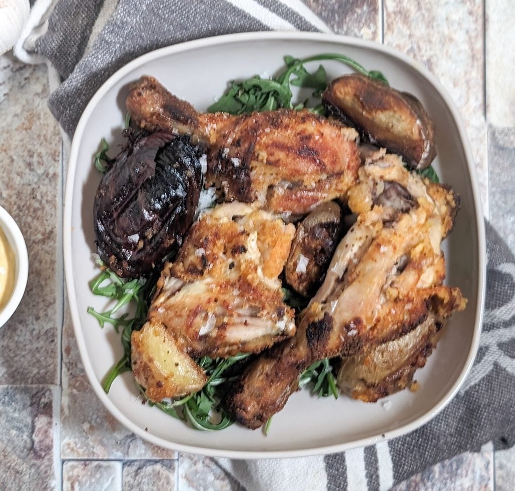¡El pollo asado especiado con pimentón y curry está listo para ser servido! Sácalo bien caliente y humeante, y córtalo con cuidado. Acompáñalo con la guarnición de patatas y cebollas asadas, y sírvelo con una sonrisa. ¡Buen provecho de DadCook!