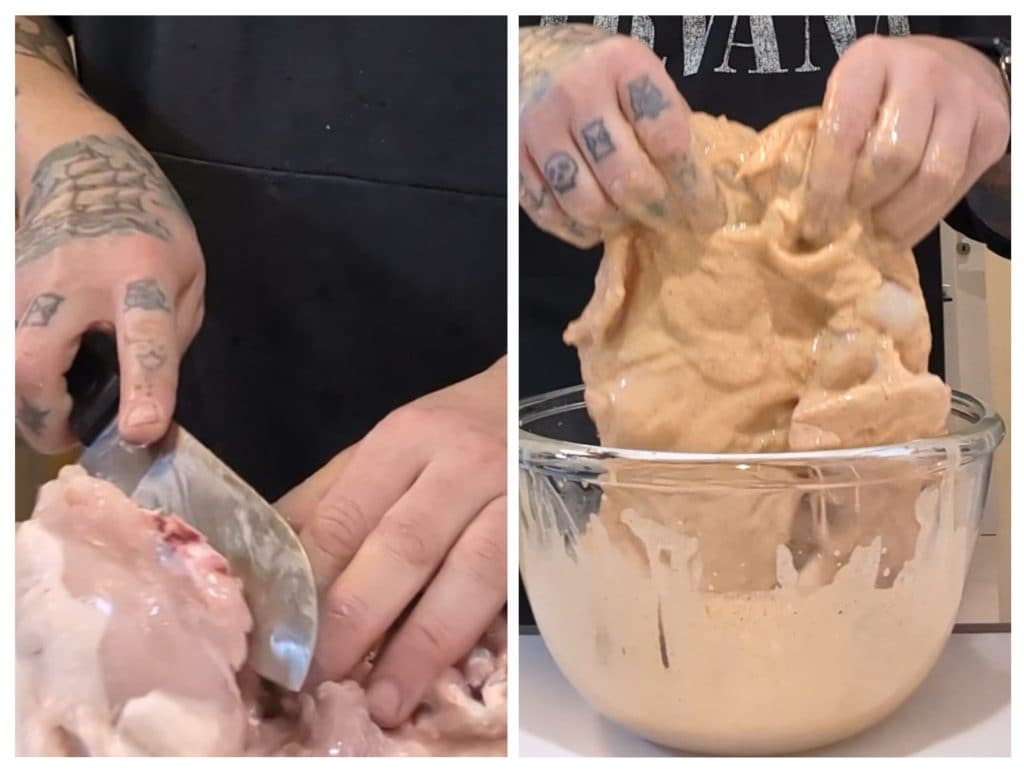 Al terminar la marinada, limpié y abrí completamente el pollo entero. Lo sumergí en la salsa, masajeándolo para que penetrara en cada parte, y lo dejé marinar en el frigorífico durante 30 minutos.