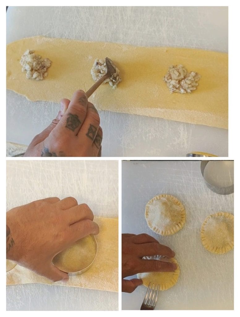 Para hacerlo, primero hacemos una lámina, con una cuchara colocamos el mero, cubrimos con otra lámina y con un cortapastas cortamos la lámina en círculo y con un tenedor sellamos la circunferencia.