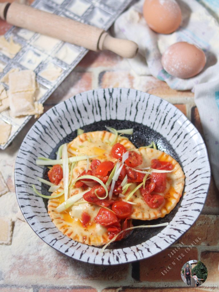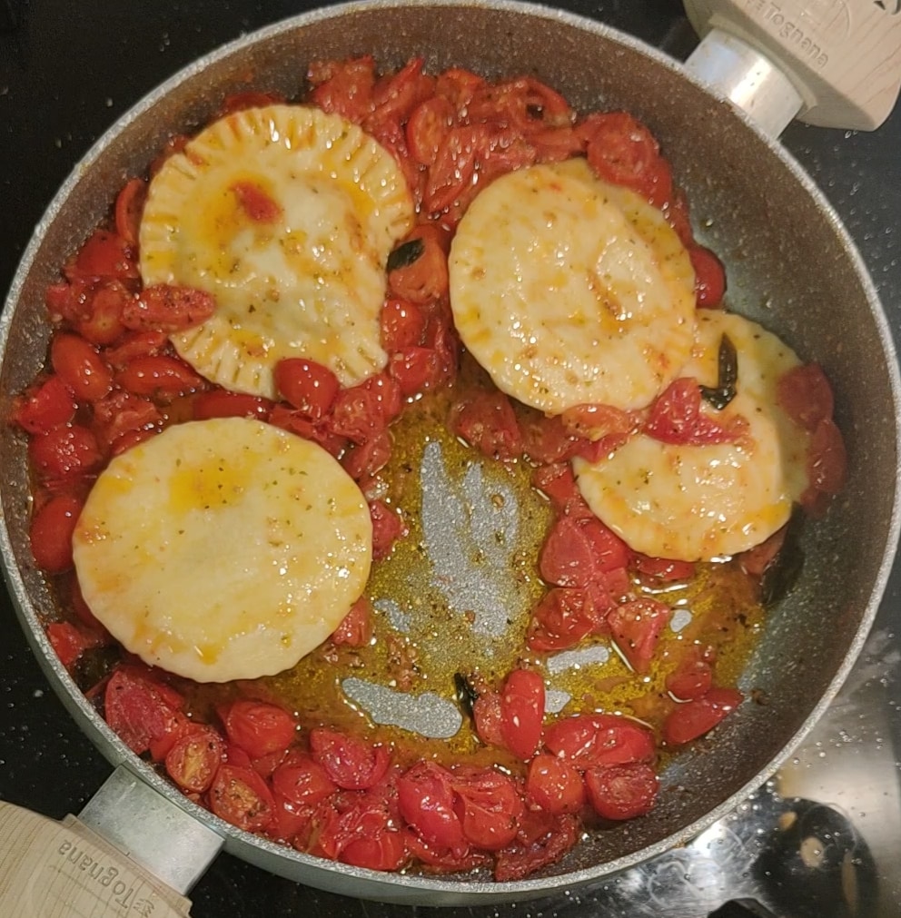Al final, después de hervir los ravioli durante unos 5 minutos aproximadamente, los volvemos a pasar en la salsa de los tomatitos preparados anteriormente, para sazonar todo.