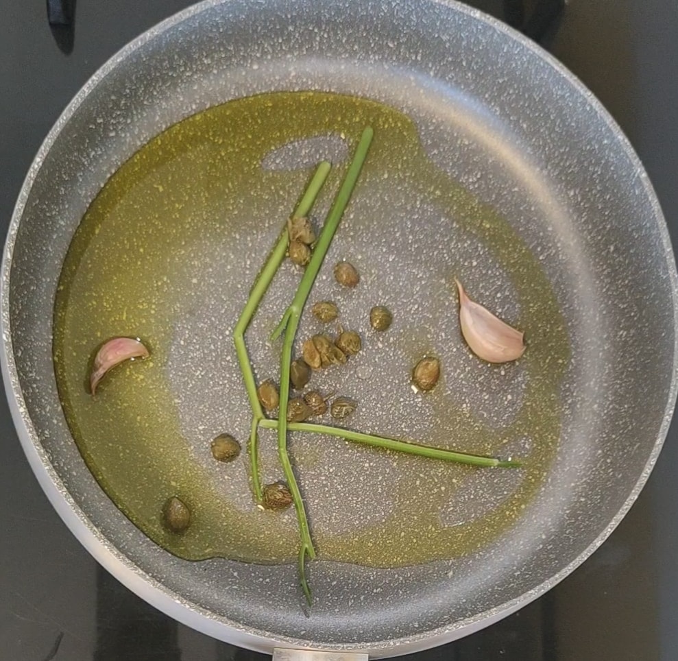 Primero que todo hacemos un sofrito con dos dientes de ajo sin pelar, un par de tallos de perejil y algunas alcaparras para sazonar el aceite de oliva virgen extra.