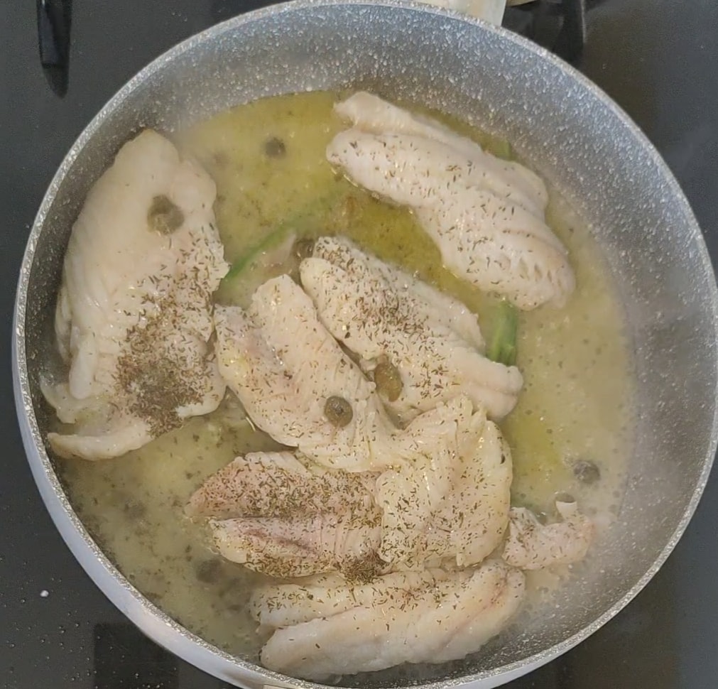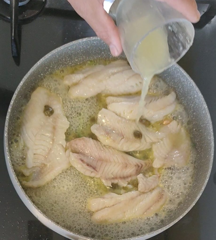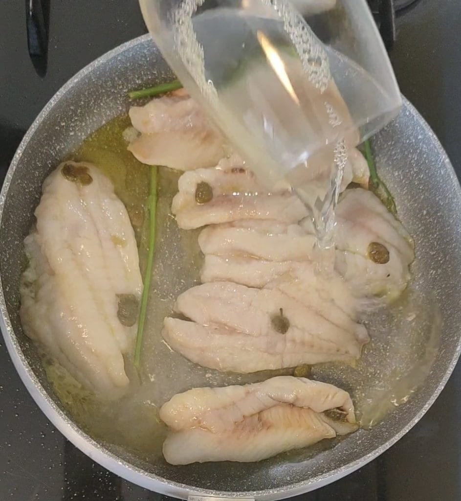 Después de sofreír unos segundos el ajo, las alcaparras y las ramitas de perejil, añado los filetes de mero y tras dorarlos por ambos lados, desglaso con el vino blanco.