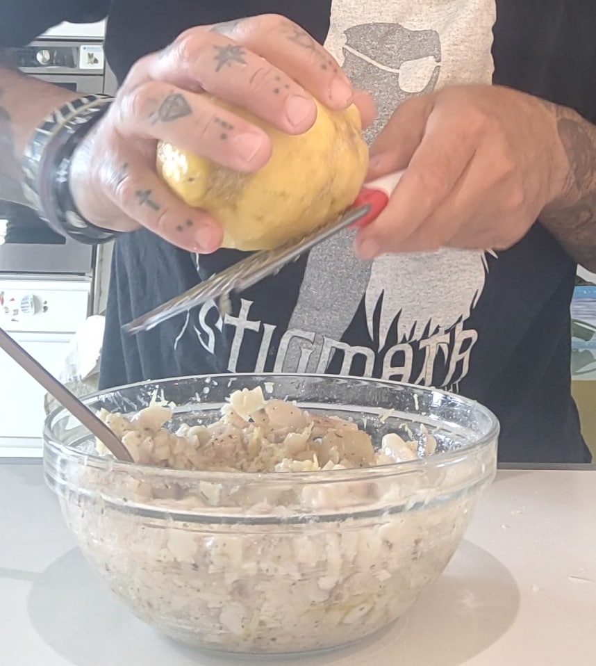 Por último, recojo el mero en un bol y rallo la cáscara del limón ecológico, mezclo todo y lo dejaremos de momento a un lado.