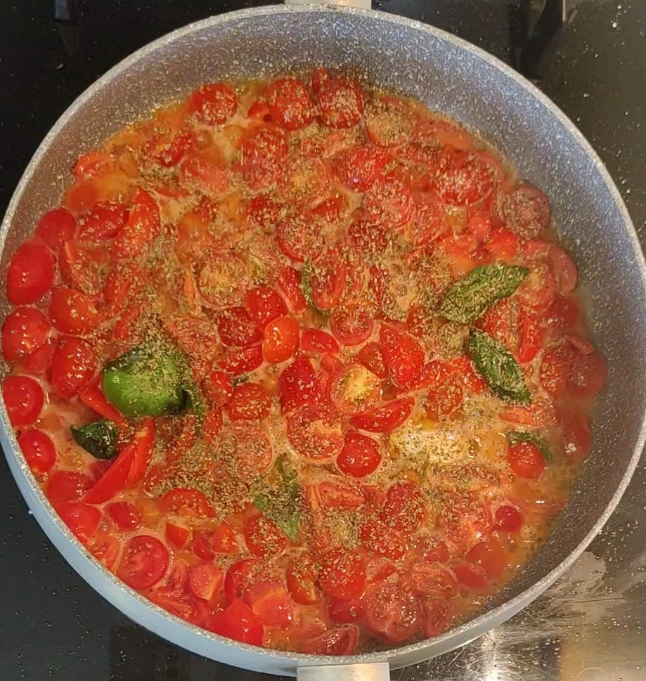 Mientras tanto he cortado todos los tomatitos a la mitad y los he añadido en la sartén para cocinarlos unos diez minutos a fuego fuerte hasta que el exceso de agua de los tomatitos se haya evaporado.