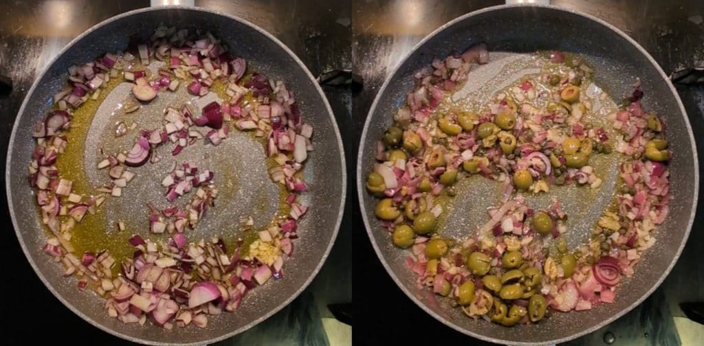 Después de picar la cebolla y el ajo, los puse a sofreír en una sartén amplia con un chorrito de aceite de oliva virgen extra. En cuanto la cebolla comenzó a dorarse, añadí las alcaparras y las aceitunas que había picado previamente con las manos. Continué friendo todo durante unos minutos, el tiempo justo para que el aceite absorbiera los aromas de los ingredientes. Este sofrito rico y sabroso será la base para nuestra deliciosa receta de sepias con guisantes.