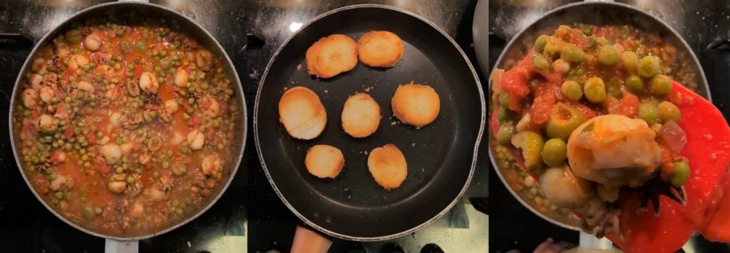 Mientras la salsa hervía lentamente, ¡se me ocurrió una idea! 😋 Decidí preparar unas rebanadas de pan tostado, untadas con una capa de mantequilla. Imaginen qué delicia: las sepias con guisantes acompañadas de un crujiente y fragante crostini… ¡irresistible! 🤤