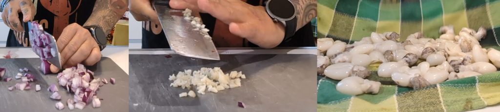 Luego, tomé una cebolla dorada y dos dientes de ajo aromáticos. Los piqué finamente, casi reduciéndolos a crema. Este picado será la base de nuestra salsa, ¡que dará a las sepias un sabor increíble! 😋