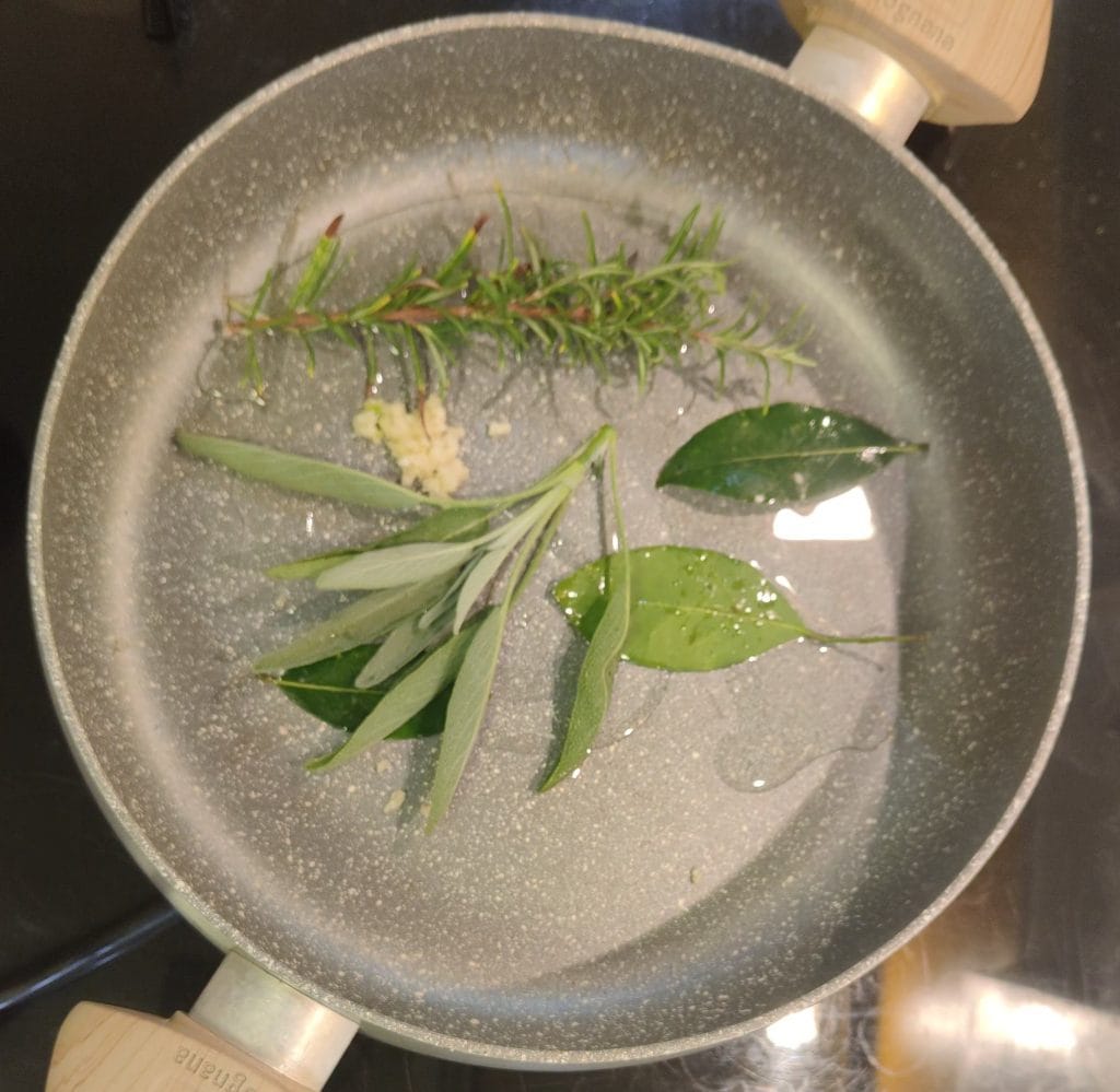 Para hacer la salchicha con salsa, primero hice un sofrito con aceite, ajo machacado, laurel y romero.