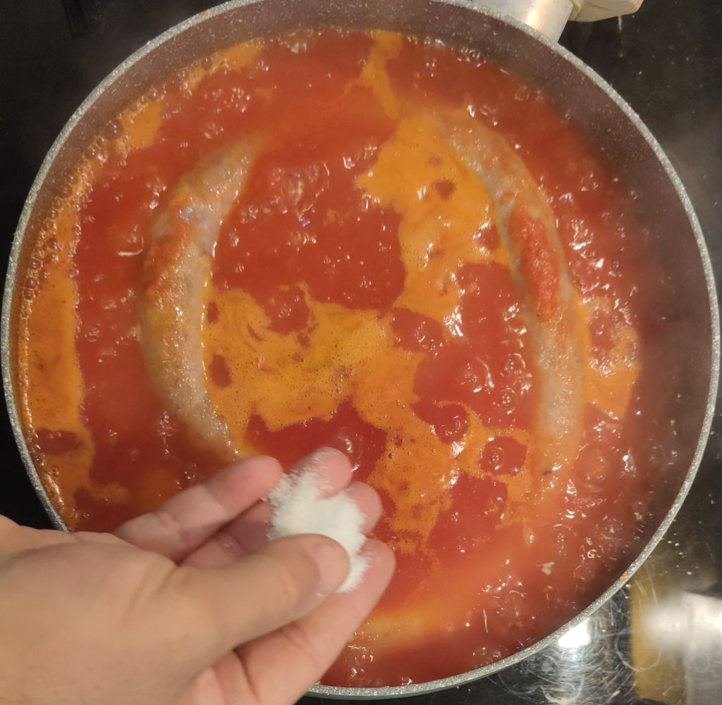 La salsa empieza a hervir, añado la sal y dejo cocer todo durante 30 minutos a fuego lento o hasta que la salsa resulte más concentrada y espesa.