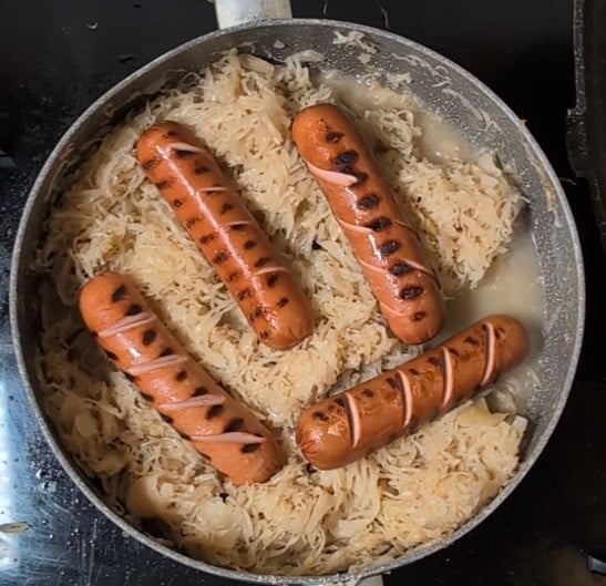 Transfiere las salchichas a la sartén con el chucrut, mezcla suavemente y prosigue la cocción durante otros 5-10 minutos, cubierto, hasta que el caldo se haya reducido aún más y las salchichas estén perfectamente cocidas.