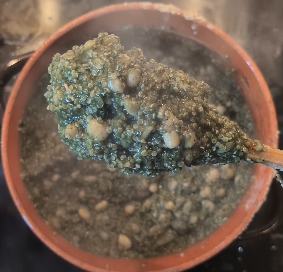 Finalmente, cuando la quinoa esté lista, apaga el fuego y añade 2 cucharadas de espirulina. Mezcla bien para integrar la espirulina a la sopa, luego cubre la olla y deja reposar unos minutos. De esta manera, los sabores tendrán tiempo para integrarse y la sopa será aún más sabrosa.