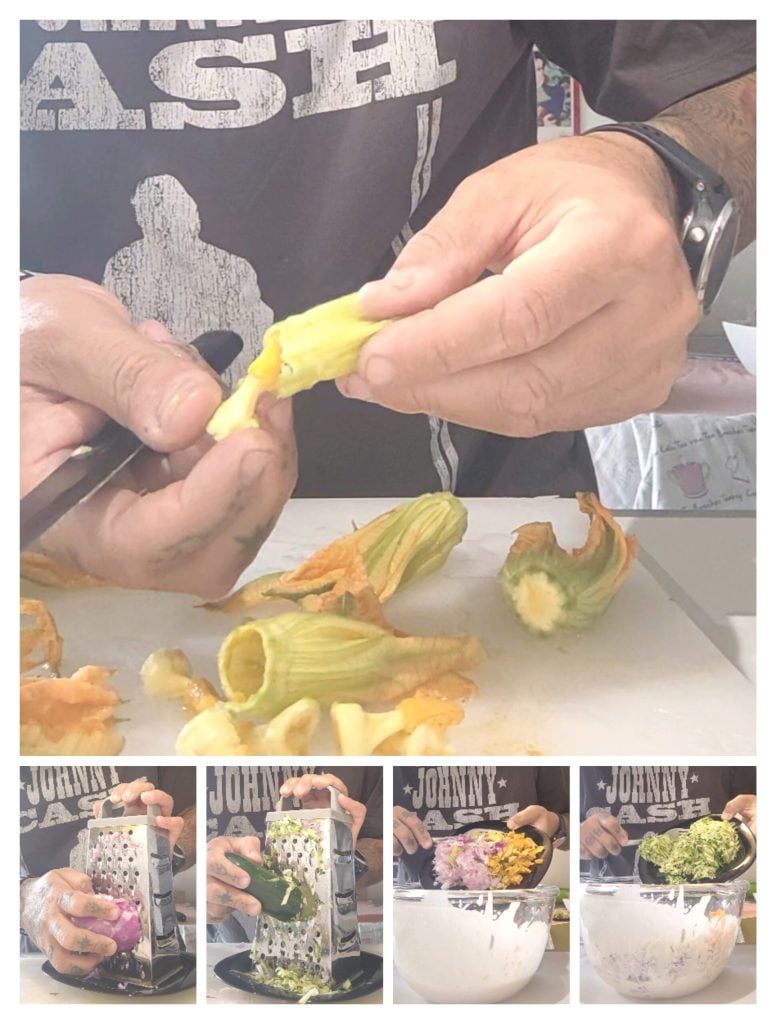 Mientras tanto, aprovecho para limpiar las flores de calabacín eliminando la parte más dura del tallo y el pistilo interno. Rallo el calabacín y la cebolla, los cuales deben ser bien escurridos con una toalla de algodón para eliminar gran parte del agua que contienen antes de añadirse a la masa.
