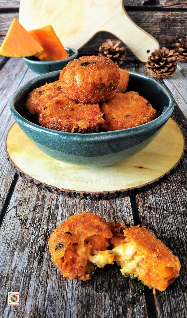 La calabaza es una verdura muy buena y se presta a varias preparaciones, tanto saladas como dulces. Os aseguro que, transformada en albóndigas, la calabaza es realmente extraordinaria. El secreto para un buen resultado está en la cocción de la pulpa en el horno, para eliminar el agua. Luego, la adición de parmesano rallado fresco, nuez moscada y perejil fresco picado realza su sabor. Sin olvidar el crujiente rebozado, cuyo secreto está en mezclar en igual medida pan rallado y sémola. Y, por último, el corazón fundente de queso scamorza.