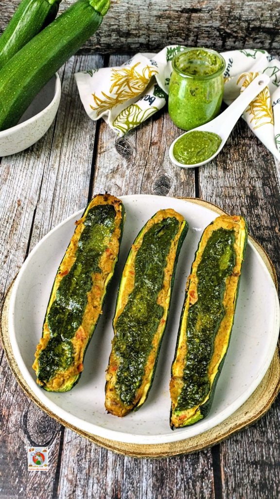 Los calabacines, bien firmes y apenas escaldados, se convirtieron en pequeños cofres para rellenar con un relleno fragante y delicioso. El atún aporta salinidad, el pesto un toque aromático irresistible.