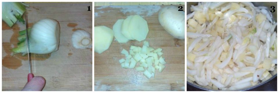 En una cacerola dorad la chalota cortada finamente con 2 cucharadas de aceite de oliva virgen extra. Luego, añadid los hinojos y las patatas y saltead durante unos 10 minutos (3).