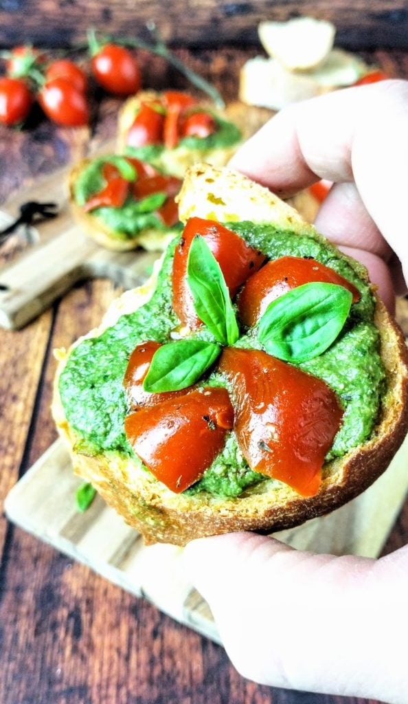 Preparar estas bruschettas es fácil y rápido. Para hacer el pesto, solo necesitas triturar los ingredientes juntos, para luego untarlo sobre los crostini recién tostados. Finalmente, se agregan los tomates y ¡el plato está listo para disfrutar!