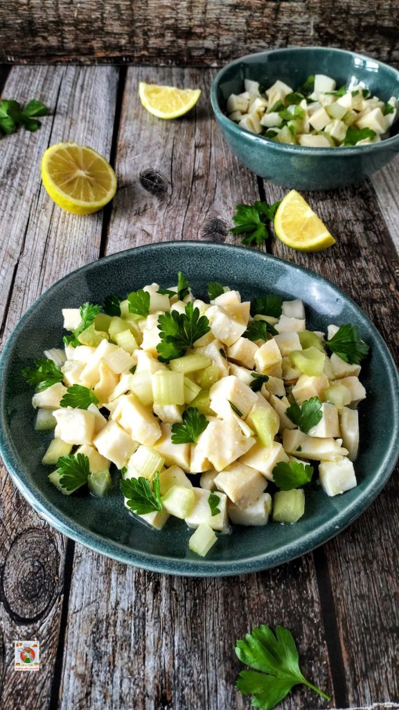 Mientras tanto, exprimir el zumo de limón; lavar bien el apio y cortarlo en trozos. Lavar también el perejil y picarlo groseramente.