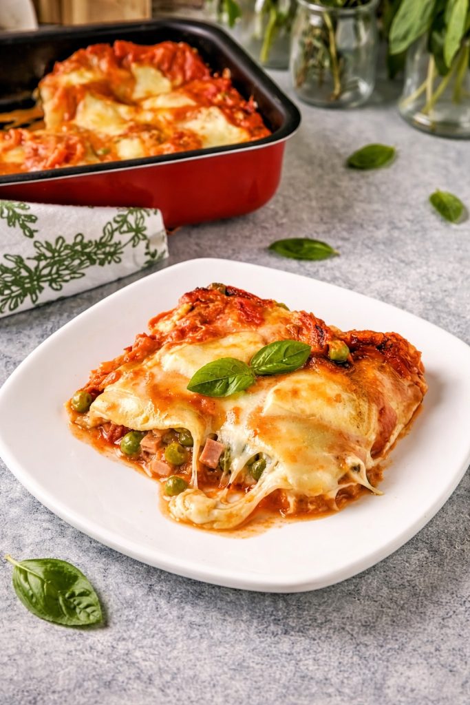 La base es una salsa de tomate aromatizada con albahaca, cocida suavemente con ajo y tomates pelados, justo el tiempo necesario para que quede aterciopelada e intensa. Para hacerla aún más golosa intervienen los guisantes, salteados en mantequilla y unidos a los dados de jamón cocido, para un relleno que aporta color y sabor a cada capa.