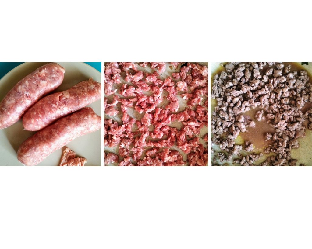 Ahora, quitar la piel de la salchicha y cortarla en trocitos con un cuchillo de punta fina. Cocinar en el mismo fondo de las setas, hasta que estén bien cocidos.