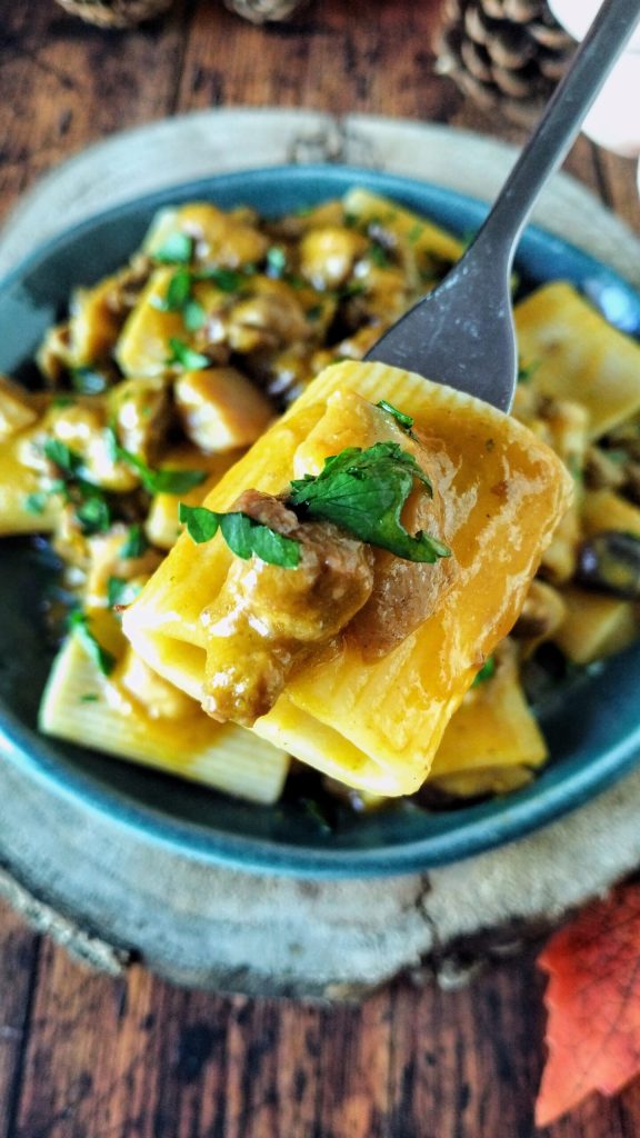 Los paccheri con setas, salchicha y calabaza son un plato que celebra el otoño en todo su esplendor, un verdadero viaje entre los sabores y los colores de esta estación. Un auténtico comfort food que sumerge en los cálidos paisajes otoñales con el aroma del bosque y de la calabaza, que invade el aire.