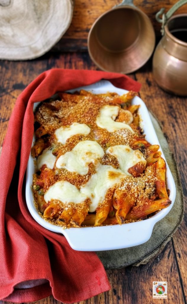 Pero el verdadero secreto de esta pasta al horno es un pequeño truco de familia: en lugar del clásico parmesano rallado, espolvorea la bandeja con pan rallado. Este simple gesto crea una costra crujiente que contrasta maravillosamente con el interior suave y fundido. ¿El resultado? Una pasta que es una mezcla perfecta de texturas, crujiente por fuera y cremosa por dentro.
