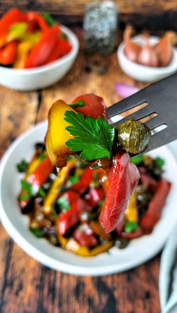 Puedes servir los pimientos con alcaparras y vinagre balsámico tanto calientes como tibios.