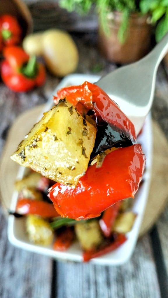 Cocina las verduras en el horno precalentado a 200°C, durante 35 minutos. A mitad de cocción, remueve los pimientos y las patatas.