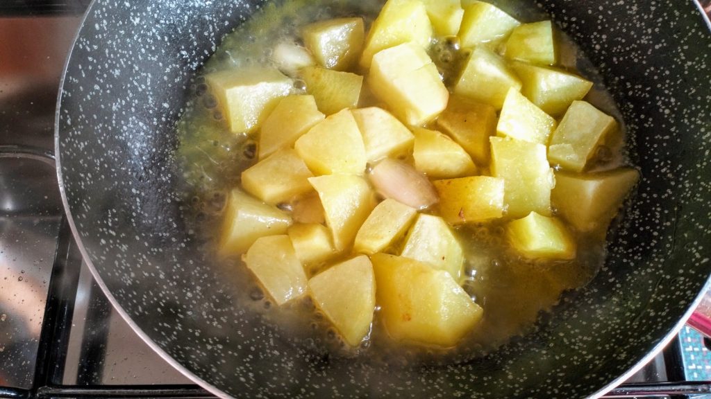 Mientras se cuece el pulpo, pelad las patatas y cortadlas en trozos.