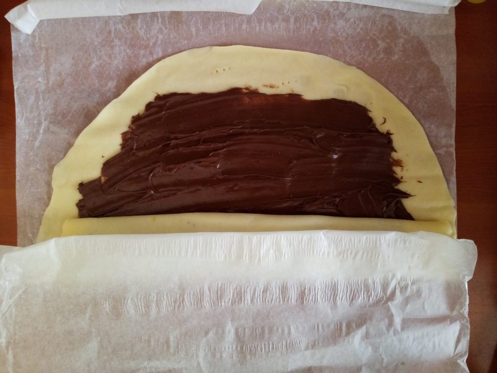 Coloca los rollitos de masa quebrada con chocolate en dos bandejas, cubiertas con papel de horno.