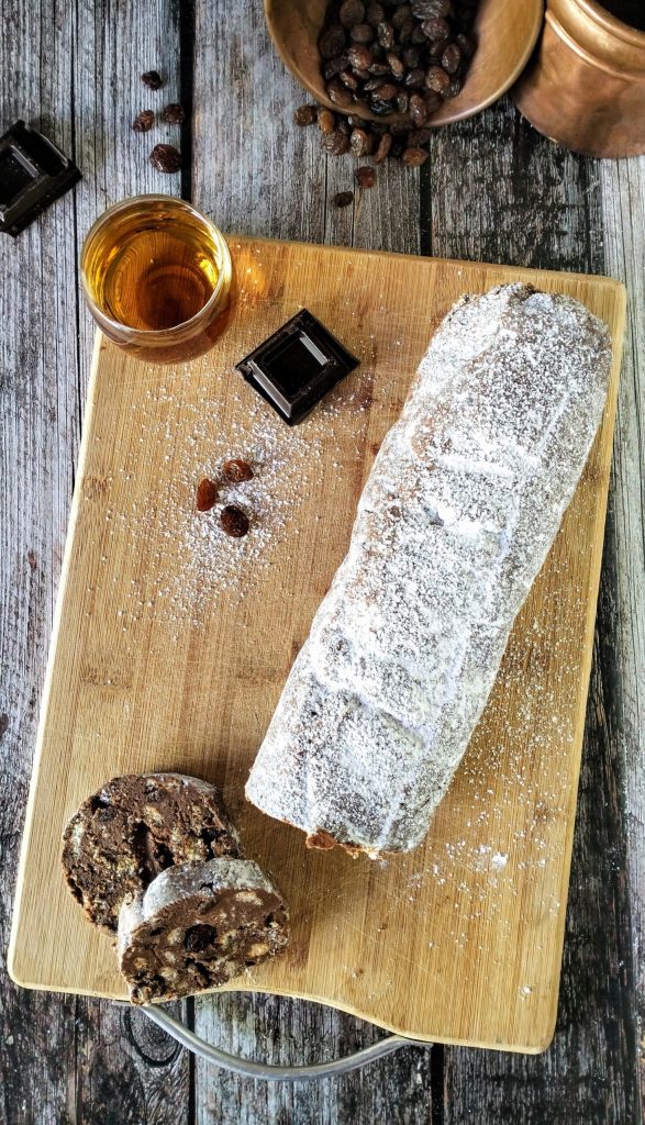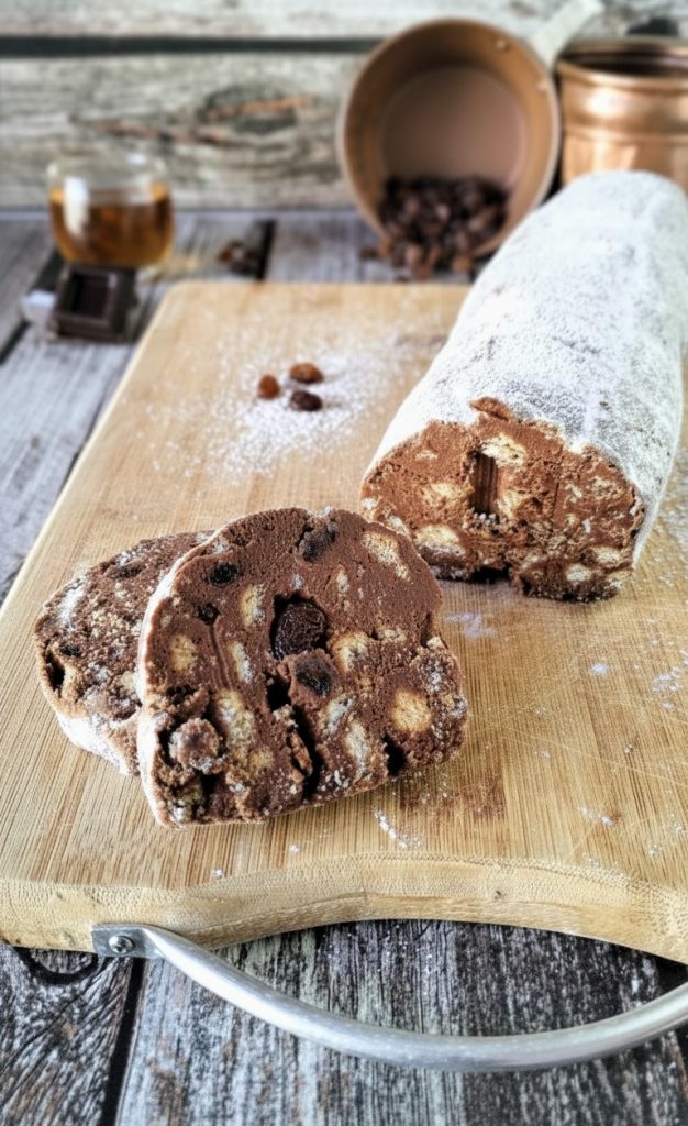 Salami de chocolate con pasas y ron: basta pronunciar estas palabras para evocar un postre intenso, envolvente e irresistiblemente nostálgico. Un gran clásico de la cocina casera, enriquecido por el carácter decidido del chocolate negro, la dulzura natural de las pasas y el aroma cálido y envolvente del ron, que transforma una receta simple en una pequeña obra maestra de sabor.