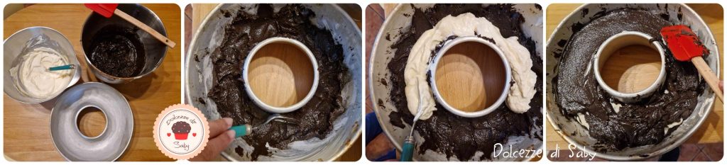 A este punto dedícate a la preparación del relleno de cheesecake. En un bol vierte el queso quark, azúcar, huevo, extracto de vainilla y finalmente almidón de maíz. Bate solo 1-2 minutos para evitar que la crema se vuelva demasiado líquida. Ahora engrasa un molde para bizcocho de 22-24 cm y vierte la mitad de la masa negra, ayudándote con la parte cóncava de una cuchara, haz surcos hacia el exterior e interior del molde con la masa de manera que la crema quede dentro de la parte oscura. Luego vierte la crema cheesecake dentro y trata de usar siempre la misma cantidad en toda la superficie del molde. Cubre luego con el resto de la masa del bizcocho negro, nivela y hornea durante aproximadamente 50-60 minutos en horno estático a 175º.