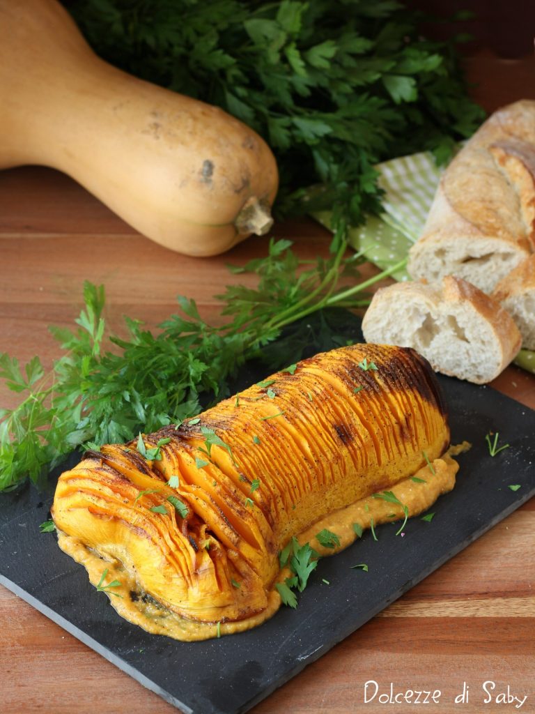 • Empieza cortando la calabaza butternut por la mitad a lo largo, vacíala de las semillas y pélala con un pelador de patatas. En este punto, toma 2 cucharas de madera, colócalas a ambos lados de la calabaza y empieza a cortar la calabaza en finas rodajas teniendo cuidado de no llegar hasta el fondo. Las cucharas de madera servirán como grosor para no cortar completamente la calabaza.