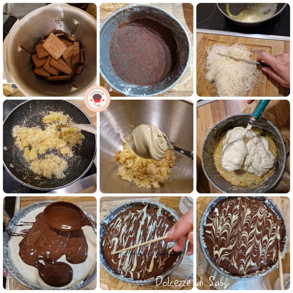 Empezaré diciendo que además de los ingredientes clásicos para la cheesecake se necesitan los fideos llamados Kadayif, que creo que ya se encuentran fácilmente también en España, son uno de los ingredientes base de los dulces orientales. Atención, para esta receta se necesitan los frescos que se encuentran en el frigorífico, porque también existen los cocidos. Yo usé un molde de 20 cm, pero con estas dosis podéis usar tranquilamente un molde de 24 cm, la crema será menos alta, pero los ingredientes serán suficientes.