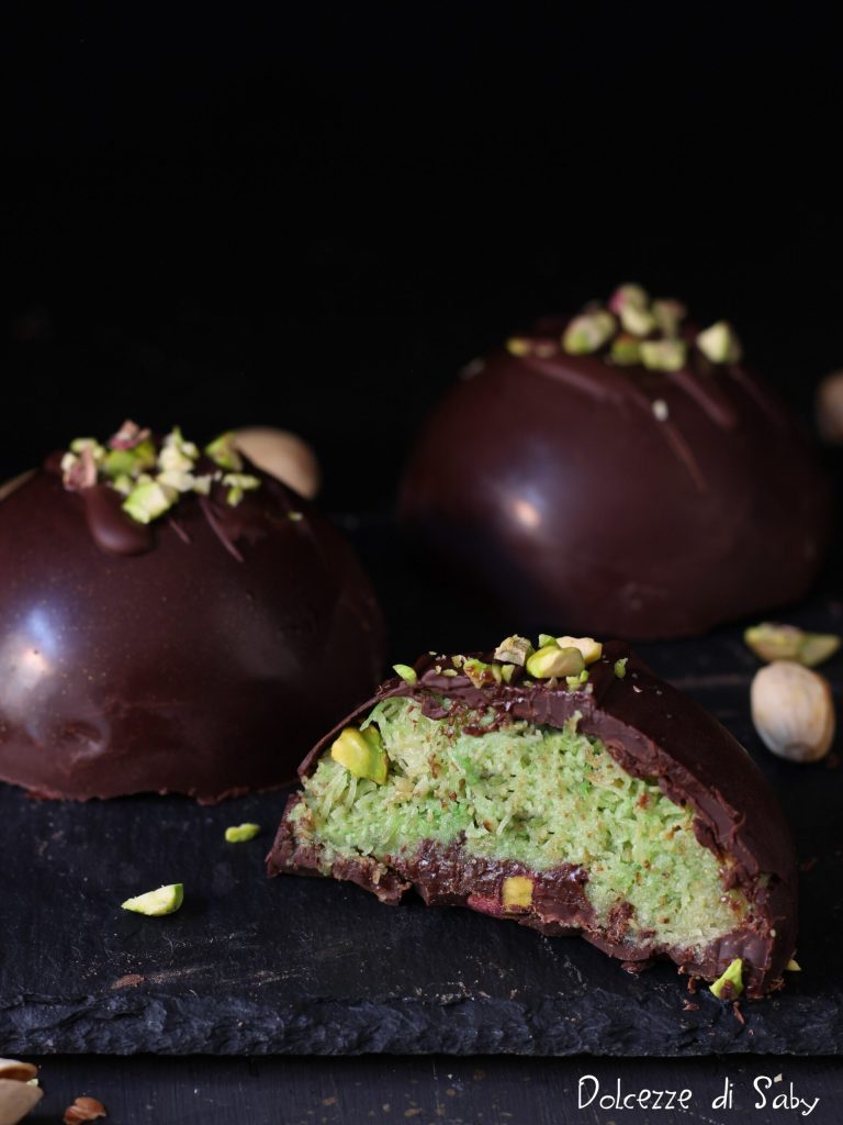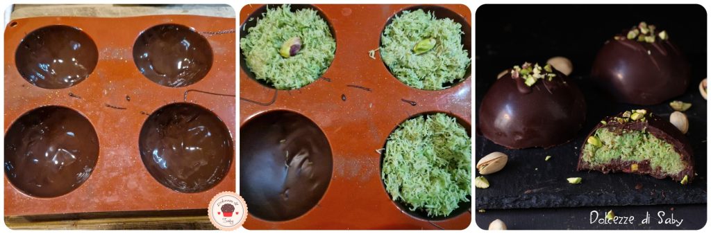 En este punto, unid la crema de pistachos al cabello de ángel, mezclad bien, luego retomad los moldes, verted el compuesto recién obtenido y vertedlo en partes iguales en cada molde de chocolate. Unid entonces granillo de pistacho, haced presión con una cuchara y colocad en el frigorífico.