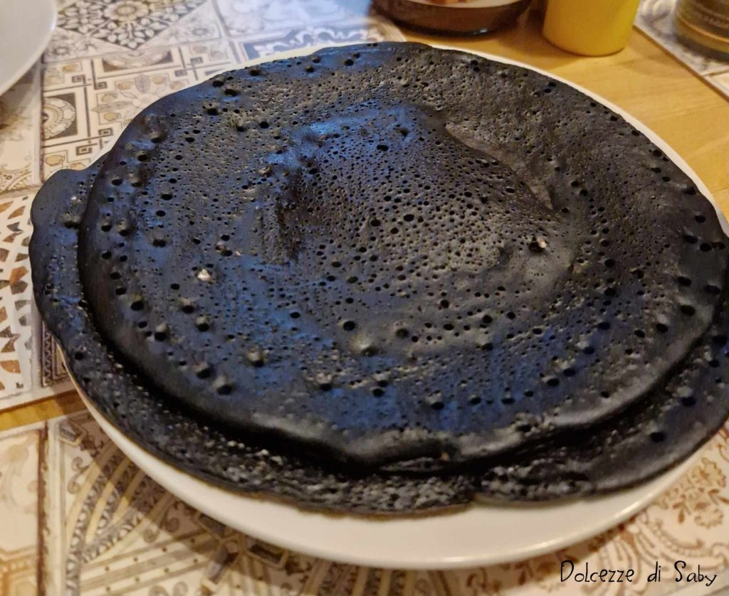 Cada año, cuando se acerca el periodo de Halloween, intento preparar una receta temática que sea, además de deliciosa, fácil y «simpáticamente espantosa» como me gusta definirla a mí. Este año, después de haber preparado unos pancakes negros (la receta la encontráis abajo), la idea de la sopa dulce monstruosa se me ocurrió en un instante. Además, tenía también unos ojitos de azúcar en casa, así que todo perfecto, listo para comenzar con la preparación de esta receta muy muy sencilla. Se trata de una crema rapidísima y unas tiras de pancake negro que simulan gusanos…¡nada más!