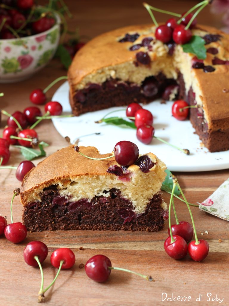 Hoy para vosotros una golosa y suavísima tarta de cerezas y cacao, perfecta para el desayuno y no solo. Esta tarta es rica en cerezas, de hecho, para hacerla usé casi 600 g de cerezas deshuesadas. Claro, yo tengo la suerte de tener un árbol de cerezas en el jardín que cada año nos regala al menos 10 kg de cerezas así que abundo, pero si no tenéis esta suerte podéis usar cerezas en almíbar. Pero ahora veamos juntos cómo se prepara esta buenísima tarta en la receta que sigue.