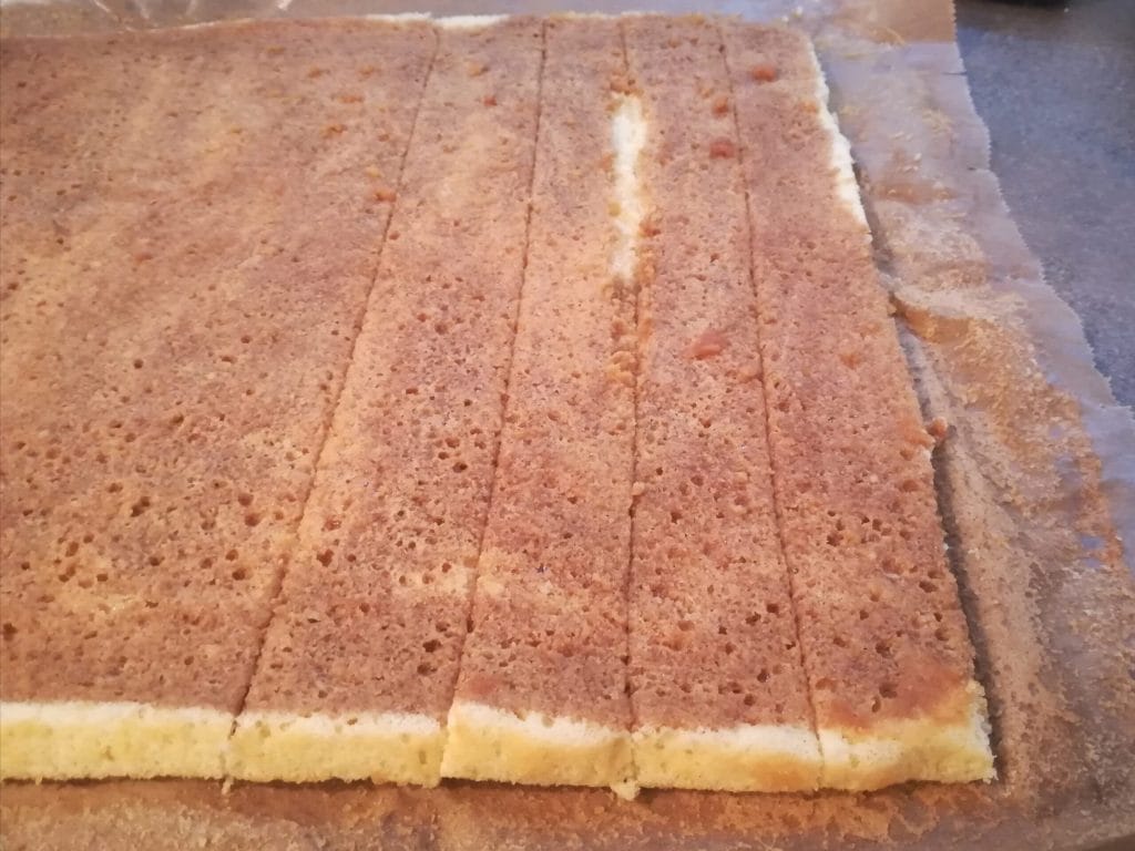 Extiende en el fondo 2/3 cucharadas de crema, moja el bizcocho con el café y haz tiras de aproximadamente 3 cm de ancho.