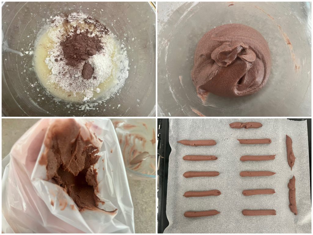 Coloca la mezcla en una manga pastelera y crea palitos largos (8/10 cm), bien separados porque en el horno se aplastarán.