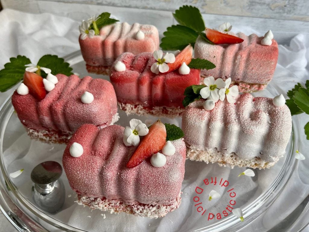 Las porciones individuales de fresa están compuestas por una base de blondies de coco, crema bávara de fresa con inserción de gelée de fresa. Por fuera están cubiertas con spray efecto terciopelo rojo y blanco, decoradas con fresas frescas y coco rallado.