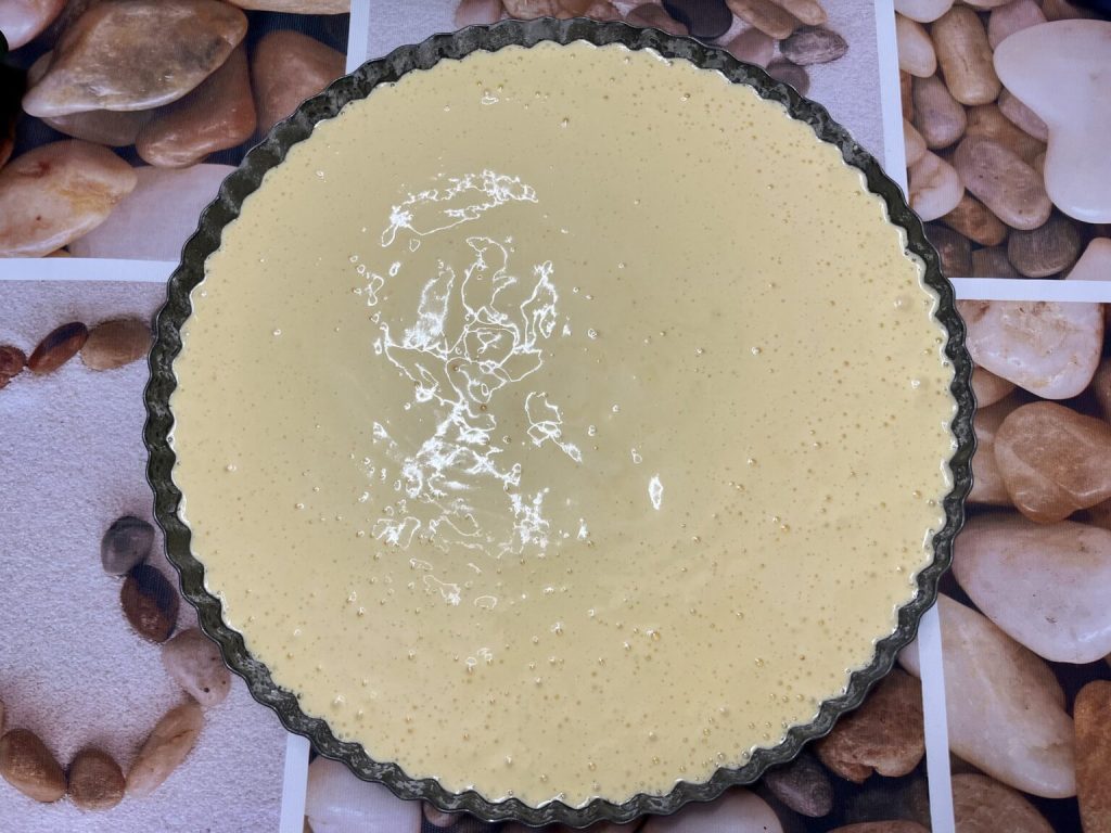 Ahora añade la harina previamente tamizada con la fécula, mezcla con una espátula y luego vierte en el molde.