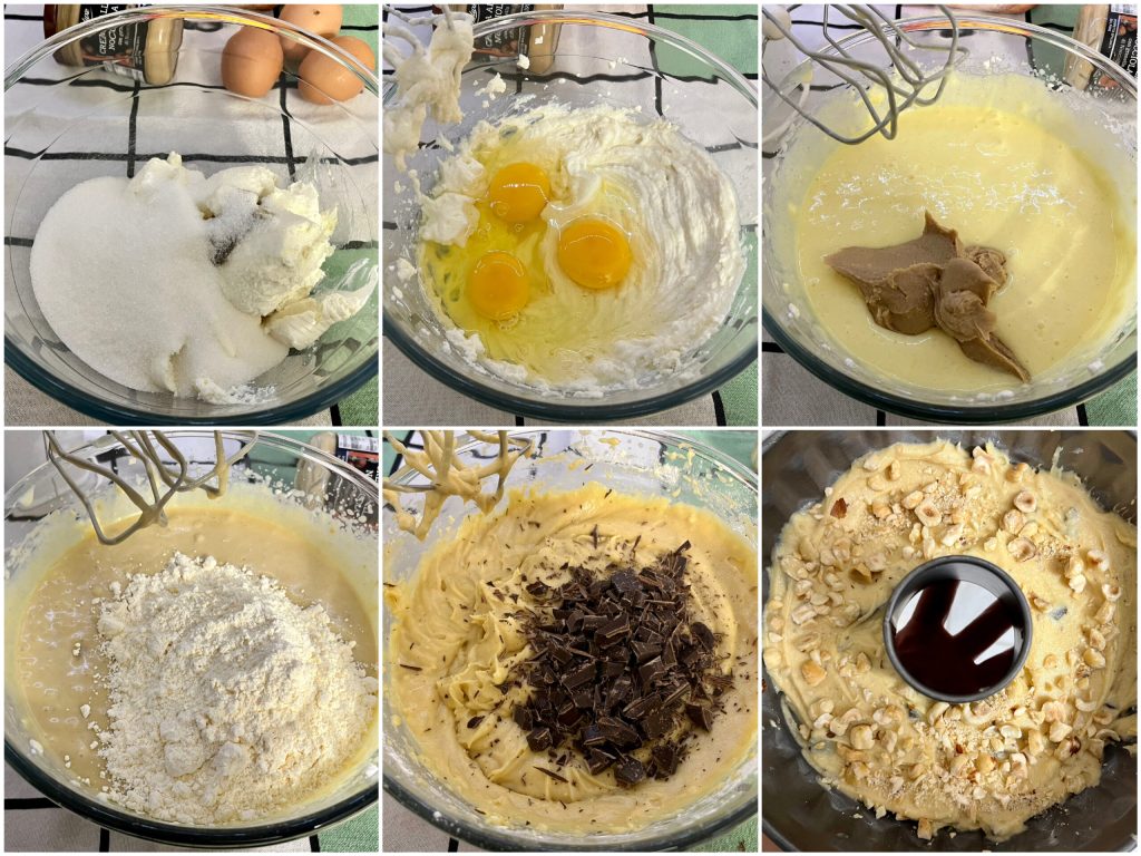 • Engrasa muy bien el interior del molde para rosquilla o bundt cake (como alternativa, también puedes utilizar un molde normal), vierte la masa y distribuye en la superficie las avellanas troceadas groseramente.