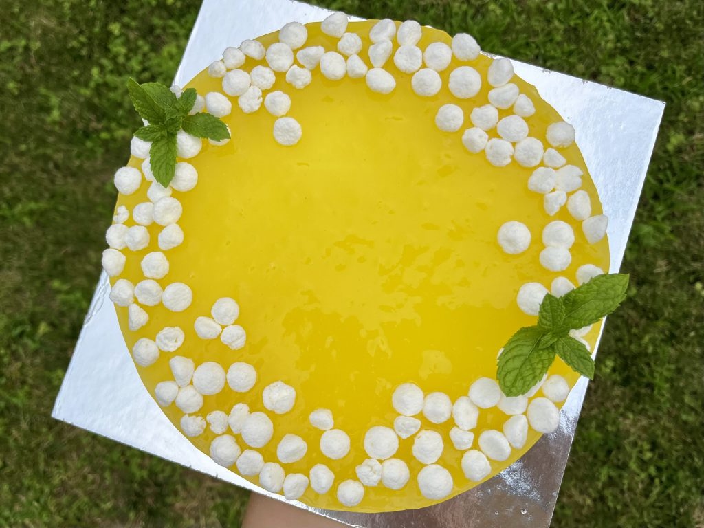 Solo queda decorar la tarta a tu gusto, yo utilicé unas pequeñas merengues que tenía en casa y algunas hojas de menta, pero también puedes usar rodajas finas de limón.