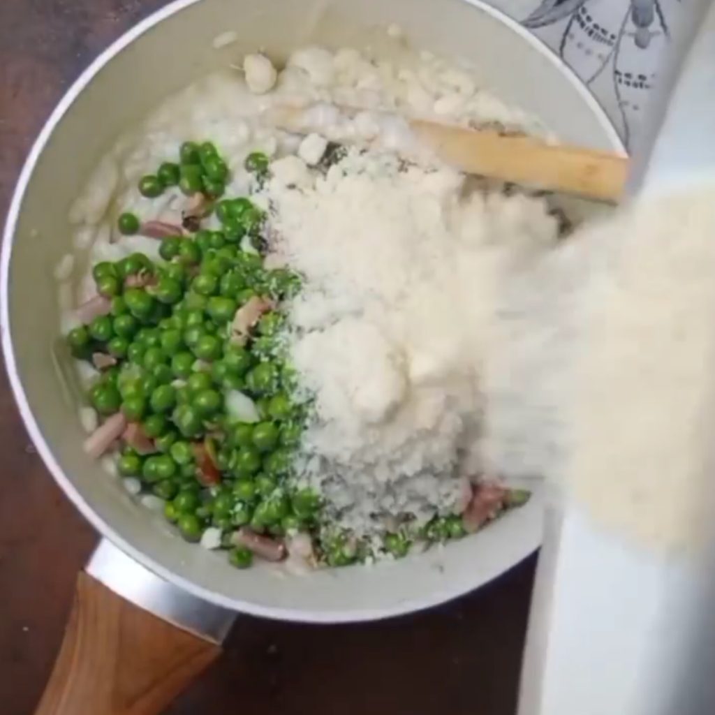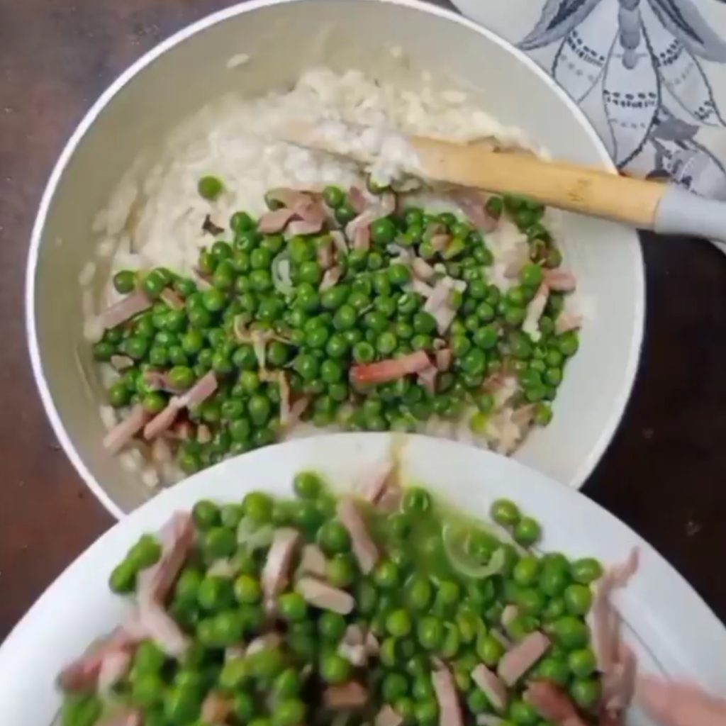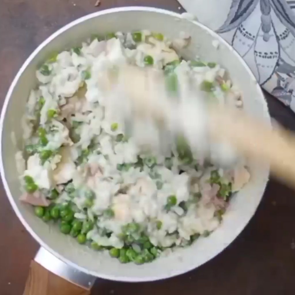 • Retoma la olla o bol con el arroz escurrido y añade primero la bechamel enfriada y luego los guisantes con el speck.