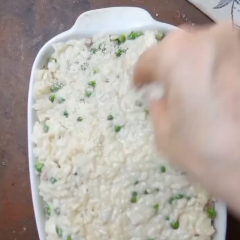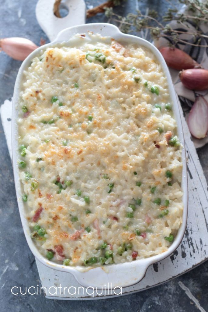 • Distribuye el queso rallado restante sobre la superficie del arroz y hornea en horno caliente ventilado a 180° durante al menos 20 minutos o hasta que se forme una deliciosa costra en la superficie.