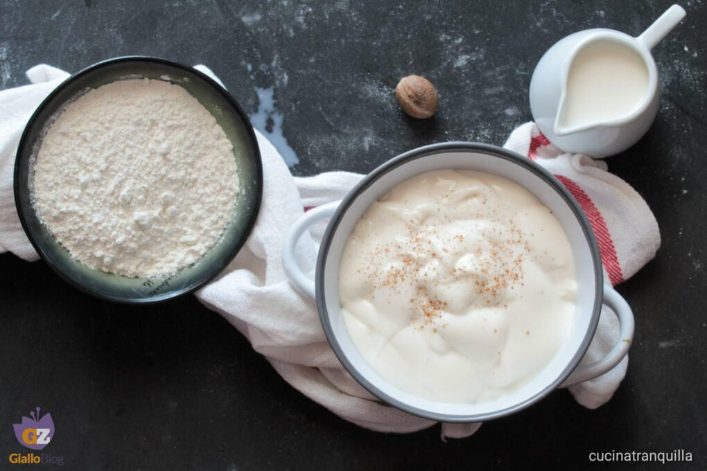 Una base de leche y queso es esencial en esta receta, por lo que se puede disolver en 300 ml de leche ricotta, para una receta más ligera o stracchino. Aproximadamente 200 g de ambos deberían ser suficientes, con una pizca de sal y nuez moscada, deberías obtener una base cremosa y homogénea.