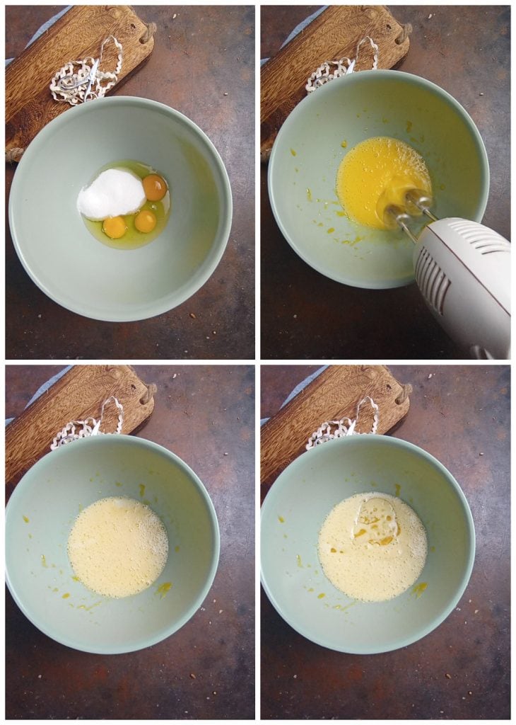 En un bol, bate, con la batidora eléctrica los huevos con el azúcar durante 2 minutos.