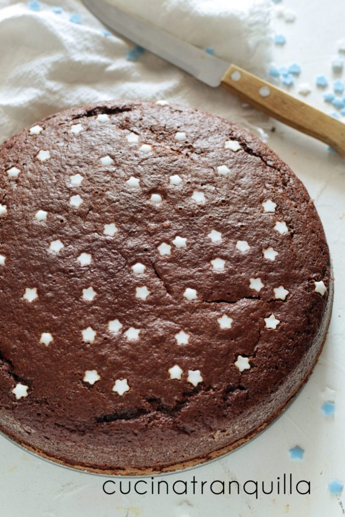 Bizcocho sin lactosa de cacao, muy fácil de hacer y muy esponjoso, decorado con muchas estrellitas de azúcar para que quede aún más bonito. Un bizcocho delicioso perfecto para cualquier ocasión que también podéis enriquecer con gotas de chocolate o con crocanti de frutos secos a elegir y añadir directamente a la masa. Como en todas mis recetas sin lactosa no usaré mantequilla sino aceite de semillas que garantizará un dulce esponjoso durante días; para la leche podéis utilizar la que prefiráis. Aquí abajo os dejo otras recetas dulces sin lactosa, y al final de la receta responderé a las preguntas más comunes sobre este tema.