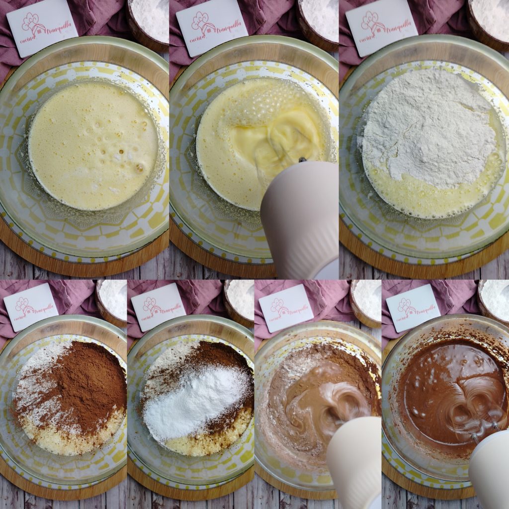 Para hacer el Bizcocho sin lactosa de cacao, lo primero es batir los huevos con el azúcar durante al menos dos minutos hasta obtener una mezcla clara y espumosa.
