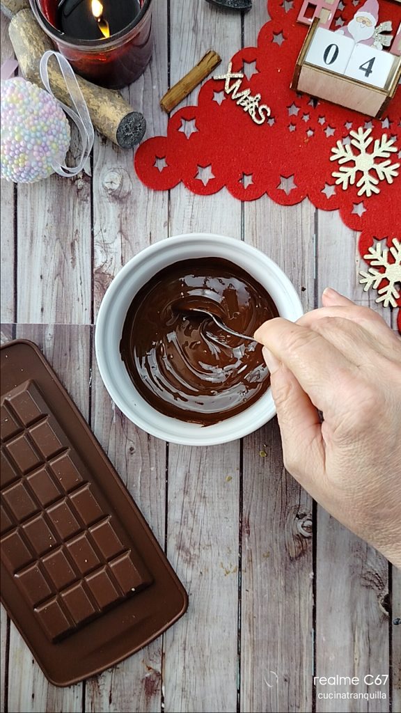 Con un palillo o un ligero movimiento, elimina posibles burbujas y vuelve a colocar el molde en el frigorífico al menos por otra hora o hasta que el chocolate esté bien solidificado.